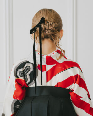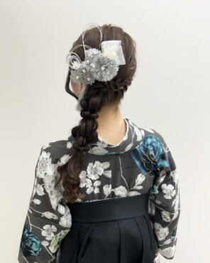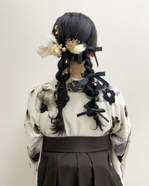 編み込みを取り入れたシニヨンスタイルに、ブラックリボンを合わせて上品さの中に程よい可愛らしさをプラス。後ろ姿まで華やかで、レトロ柄やモダンな卒業袴との相性も抜群!