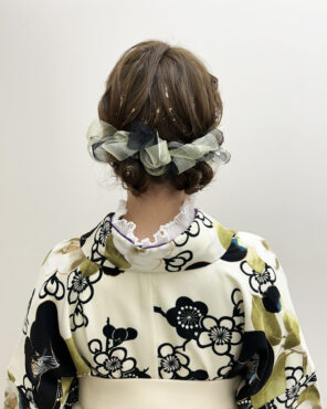 低めの位置でまとめたツインシニヨンに、透け感のあるオーガンジーリボンを添えた上品なヘアアレンジ。甘くなりすぎず、やわらかな印象に仕上がるため、大人っぽく卒業袴を着こなしたい方にもおすすめ♪