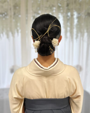コンパクトにまとめたタイトヘアに、金箔や水引をアクセントにプラス。すっきりとしたシルエットで、クール・モードな雰囲気がお好みの方におすすめ。ボブやショートヘアでも楽しめるのが嬉しいポイント☆